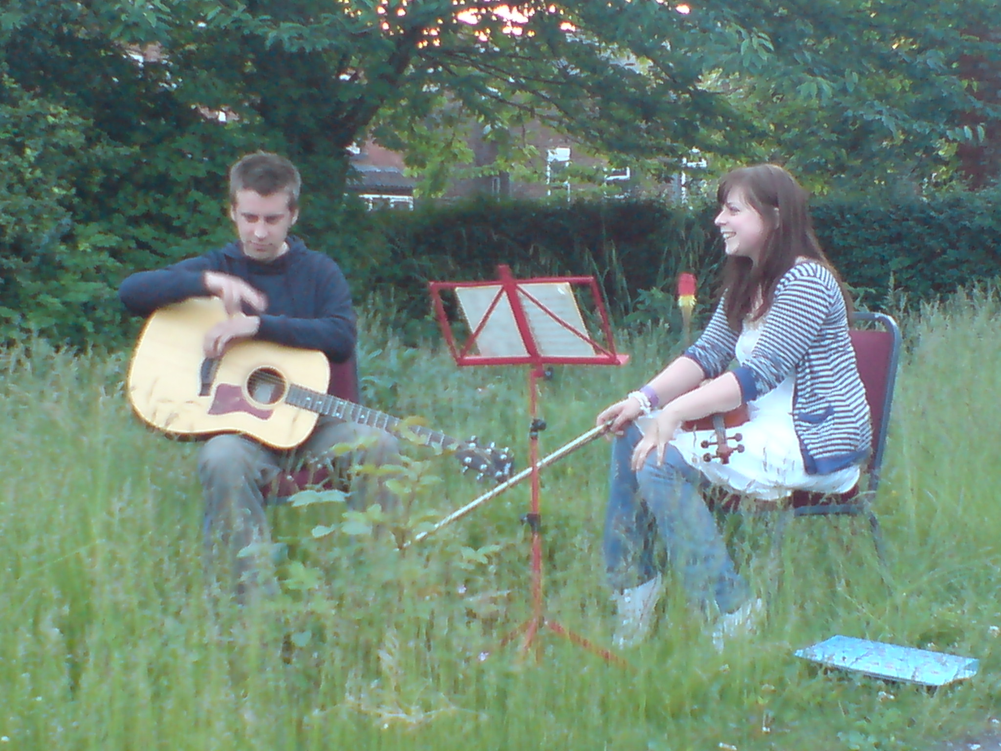 Summertime a few years ago I think, at the Klondyke in Levenshulme supporting Lianne Hall and Drei. Was such a charming June evening we decided to play out in what passes for a wild flower meadow in Lev. From what I recall there was only one incident with a passing car; there was also an audience, sadly out of shot, I suspect we’re probably trying to interact with them in the middle shot.