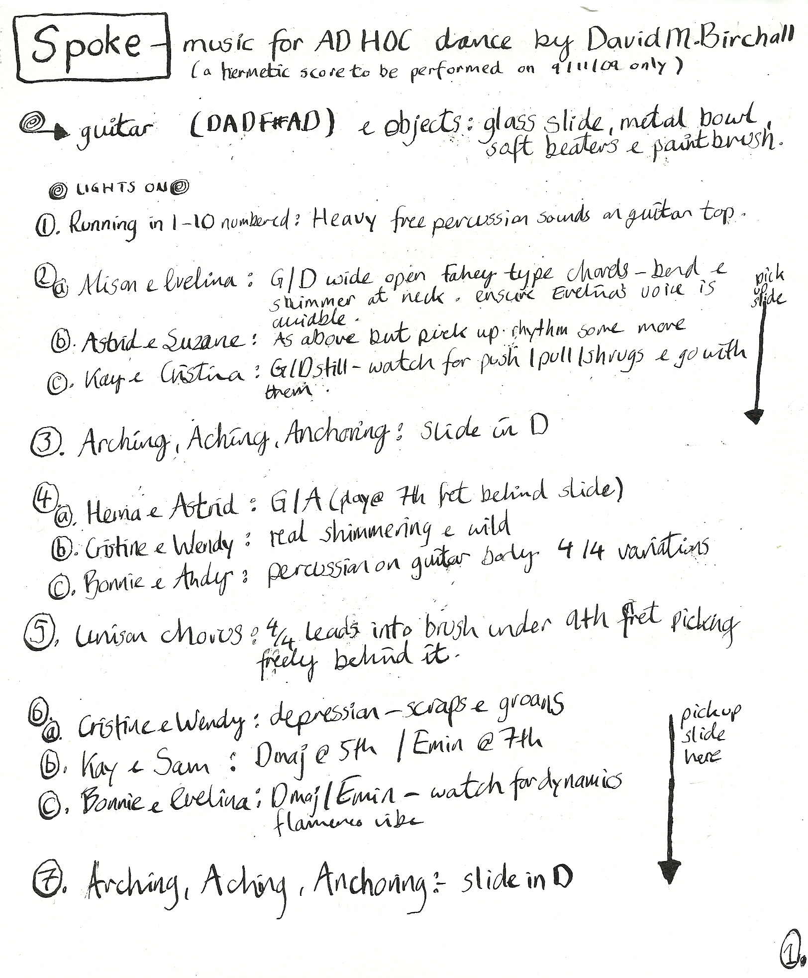 Below are the open scores, hopefully understandable to anyone with a familarity with a guitar in open tuning, some extended techniques and graphic scores. These are the tidied up versions of the documents I worked on with choreographer Ruth Tyson-Jones and the dancers to create the finished score.