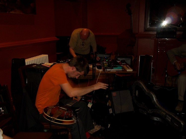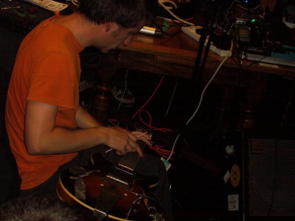 Above you can see the long suffering Ibanez having a dramatic gesture carried out on it in the foreground, Shaun Blezzard in the background and part of John Jasnoch.