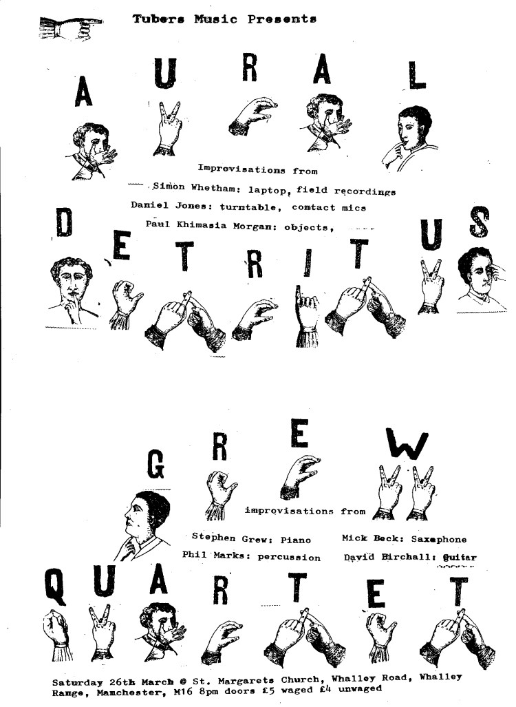 26th March Posted bydavidmbirchallMarch 7, 2011Posted ingigTags:26th march 2011, aural detritus, Grew Quartet, RUfford Road, St. Margarets Church, Tubers Music, whalley range, whalley road slight update of flyer for those who struggle to read 10pt type unaided! x Share this: Click to share on Facebook (Opens in new window) Facebook Click to share on X (Opens in new window) X Like Loading... Related