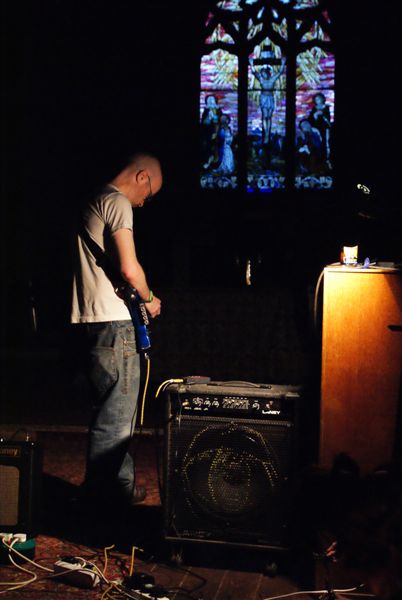 Having seen PWHMOBS a few times previously, I had some expectations of what the OEQ might be like tonight. Nichols uses (a small set of) drums and effects on his voice as percussion and Jones plays flute, gong and effects. These are all in evidence, along with Birchall contorting over his guitar, scraping, sliding, tapping and drawing some very unusual sounds from the strings. The bass meanders beneath all this, being the most recognisable element of the set up, in that the sounds it made were conventionally that of a bass guitar, but not in the sense that it provided any standard rhythmic underpinning.