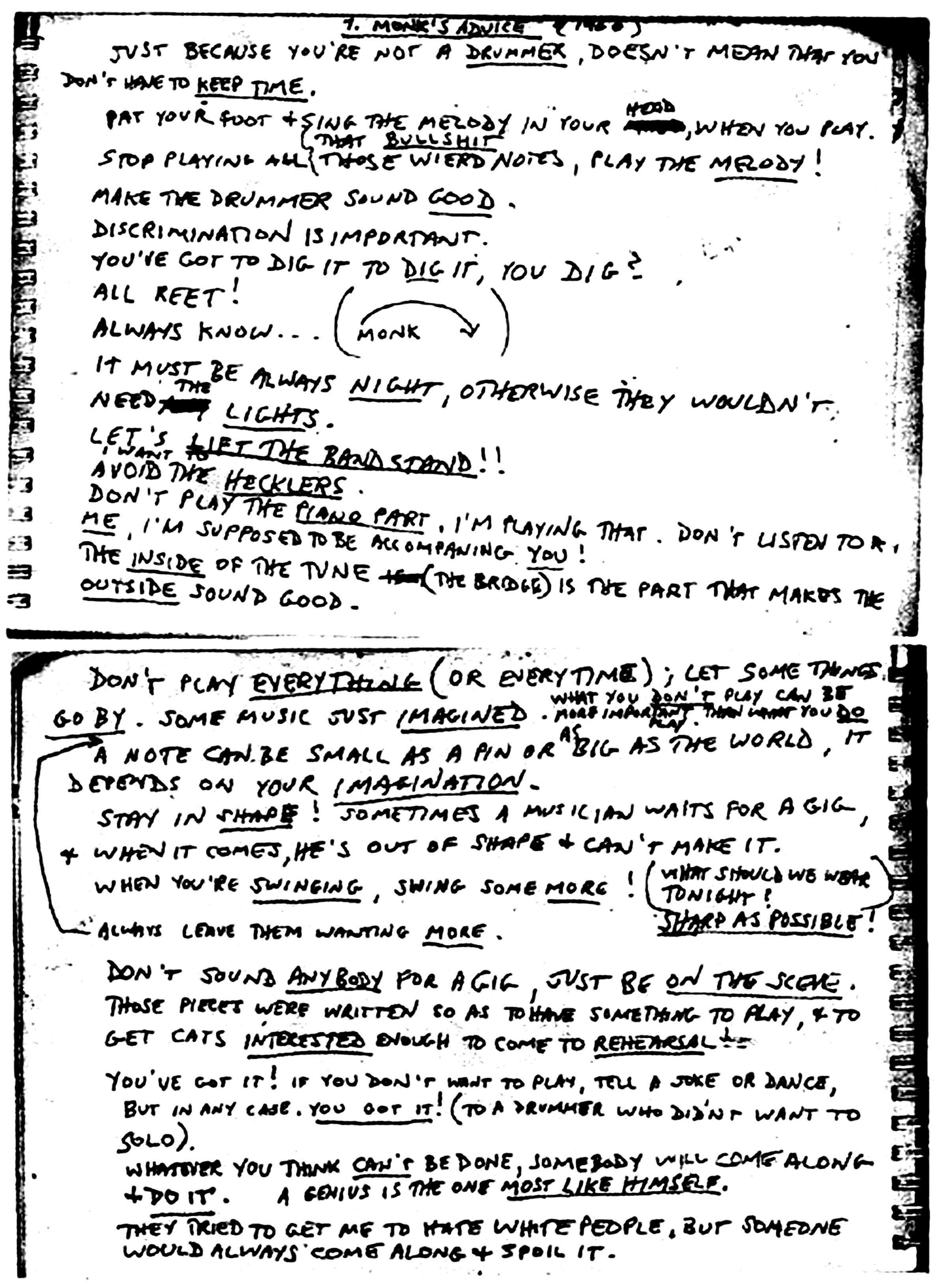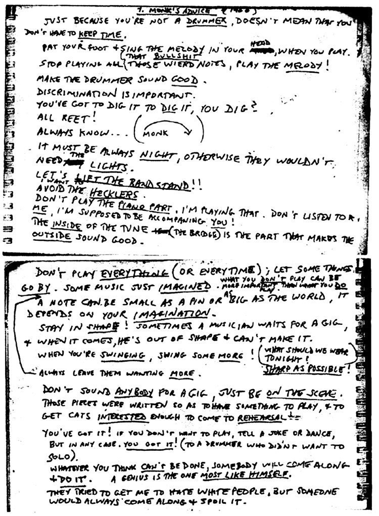 Monks Advice Posted bydavidmbirchallMay 16, 2012Posted inUncategorizedTags:monks advice As transcribed by Steve Lacy. Was on the wall in Richard Scott’s studio where we were recording last few days. Thought alot of it was still rather relevant. Share this: Click to share on Facebook (Opens in new window) Facebook Click to share on X (Opens in new window) X Like Loading... Related